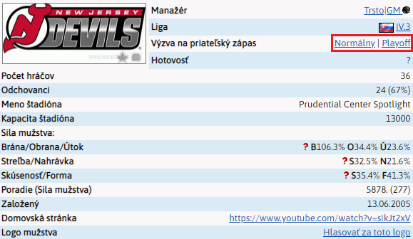 Výzva na priateľský zápas. Máš možnosť si vybrať z dvoch možností : Normálny alebo Playoff (viď. obrázok nižšie). V Playoff zápase sa zápas v prípade remízy